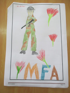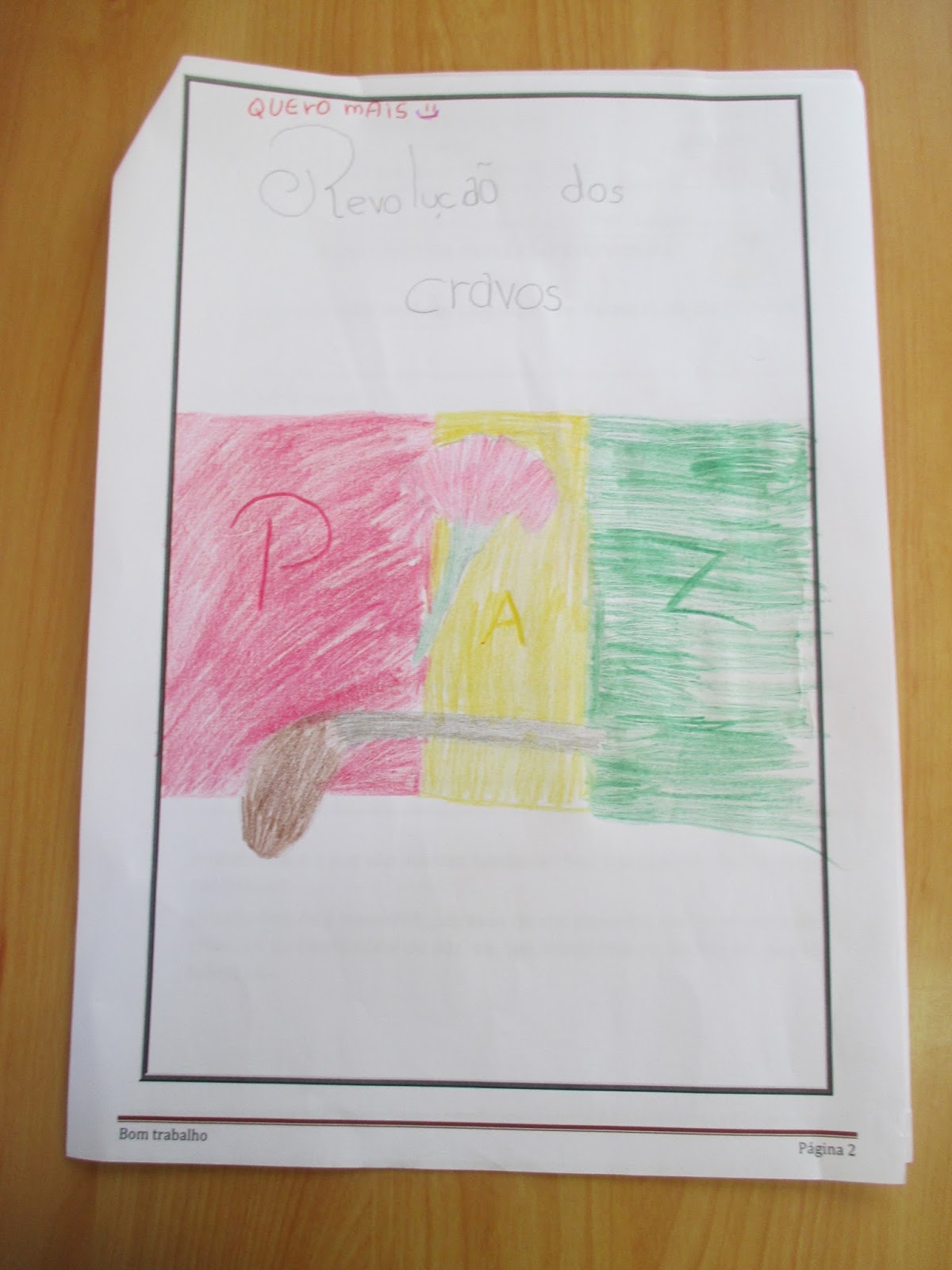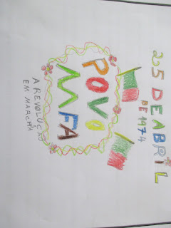 Para melhor conhecermos a história do nosso país e o motivo pelo qual é ferido nesse dia, 25 de abril, a Maria João preparou-nos uma aula sobre a revolução dos cravos. Na sua aula utilizou um cartaz enorme com muitas fotos, realizamos uma ficha de trabalho e desenhamos .