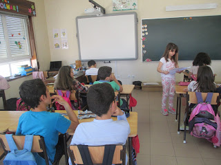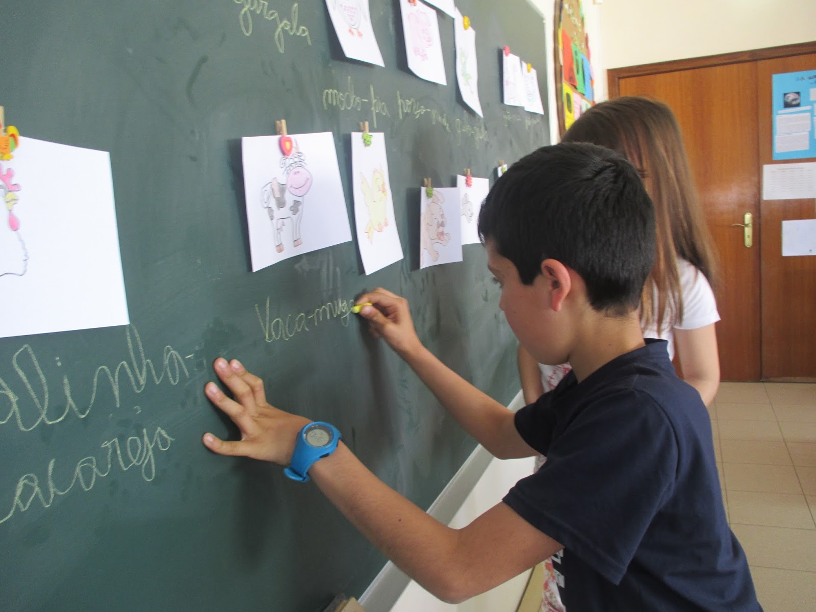 No dia do seu aniversário, a Beatriz deu-nos uma aula sobre as palavras onomatopaicas e onomatopeias. Para isso, usou um poema "Vozes dos Animais"de Pedro Dinis. Identificamos as palavras onomatopaicas no poema.