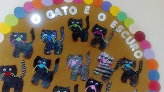 Pintalgato é a personagem do livro de Mia Couto "O Gato e o escuro". Primeiro pintamos o gato muito colorido, a lápis de cera. Depois de preto e decoramos fazendo desenhos e raspando.