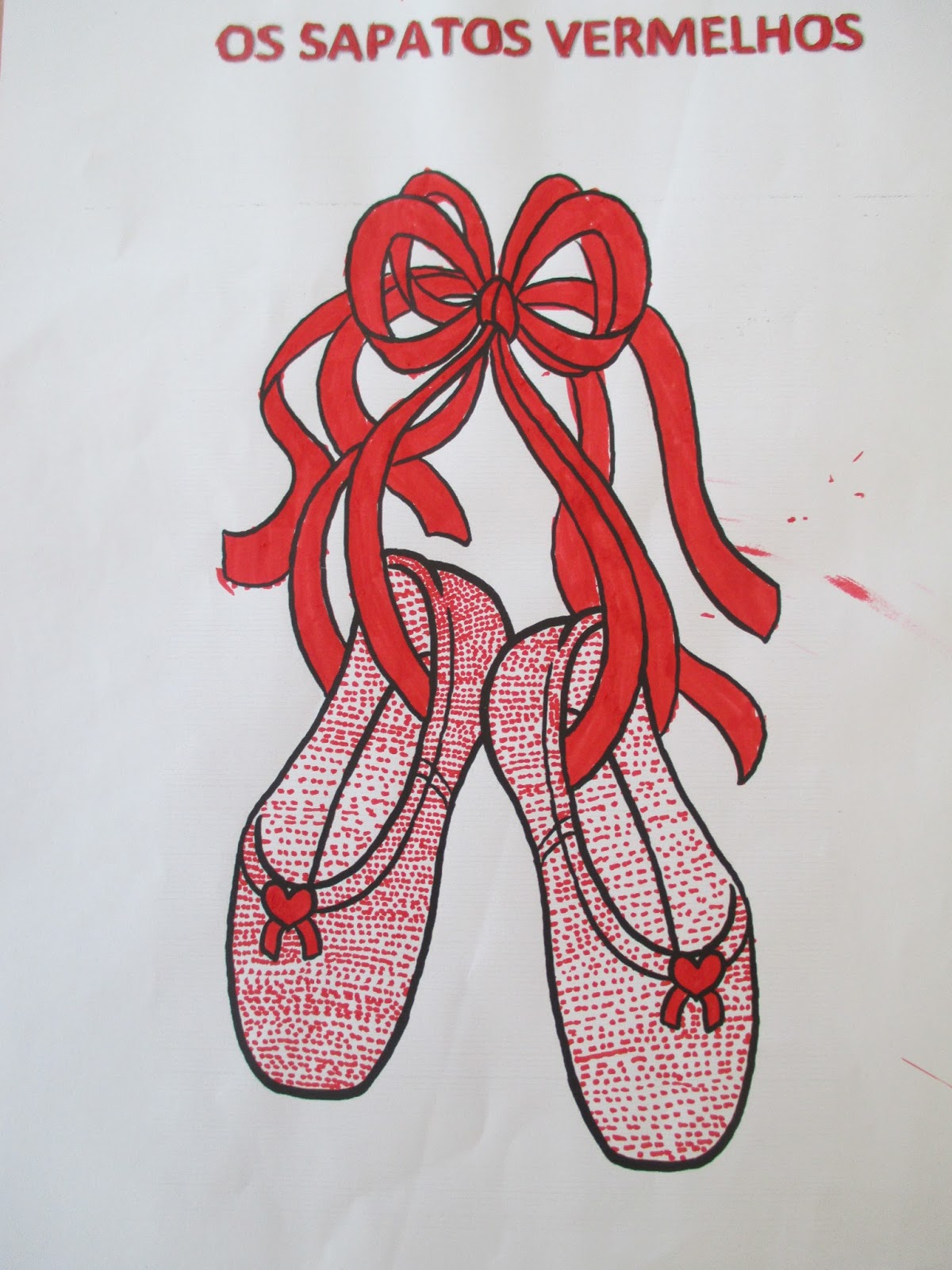 Estivemos a estudar o conto "os sapatos vermelhos" de Hans Christian Andersen. Pintamos os nossos sapatos vermelhos usando a técnica das pintinhas.