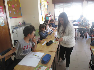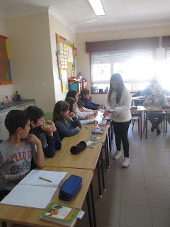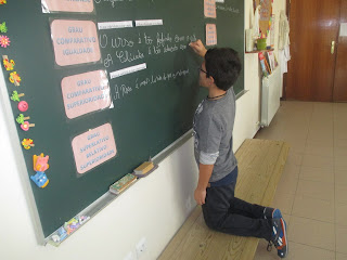 Hoje, a Bruna deu-nos uma aula sobre os graus dos adjetivos. Primeiro, relembrou os diferentes graus dos adjetivos usando um cartaz. Depois verificou os nossos conhecimentos através de um jogo. Cada aluno recebeu uma frase que tinha que identificar a que grau pertencia. Foi assim, que revemos esta matéria. Segunda-feira já ninguém vai errar na ficha de avaliação. Obrigada, Bruna, foste uma boa professora. És uma professora estrelinha!